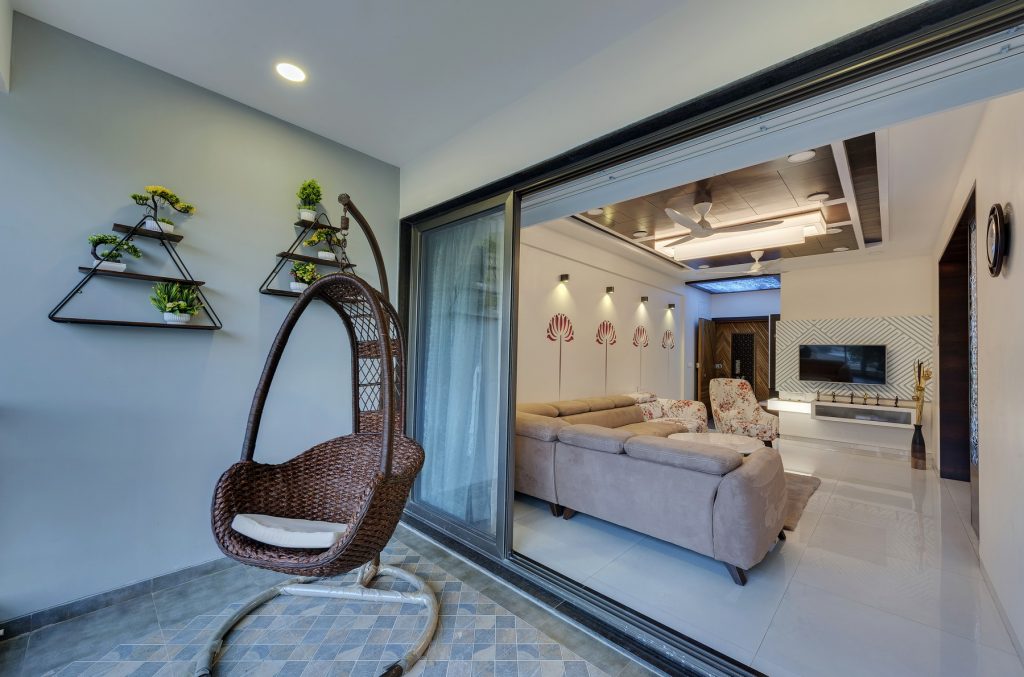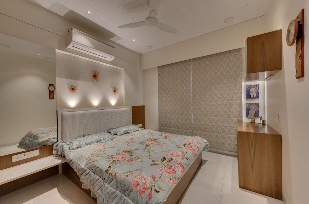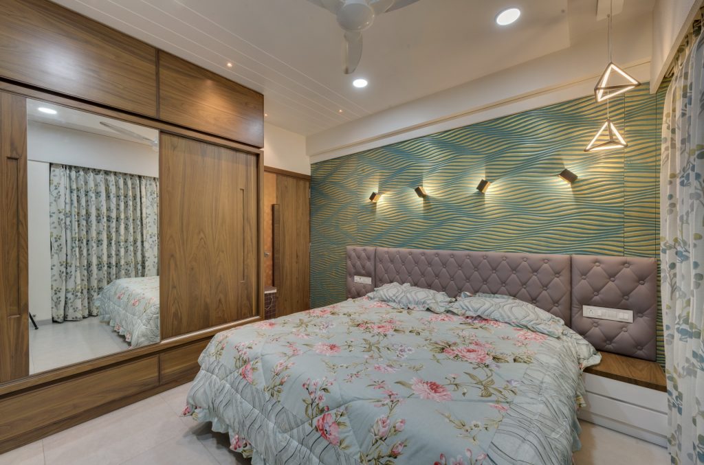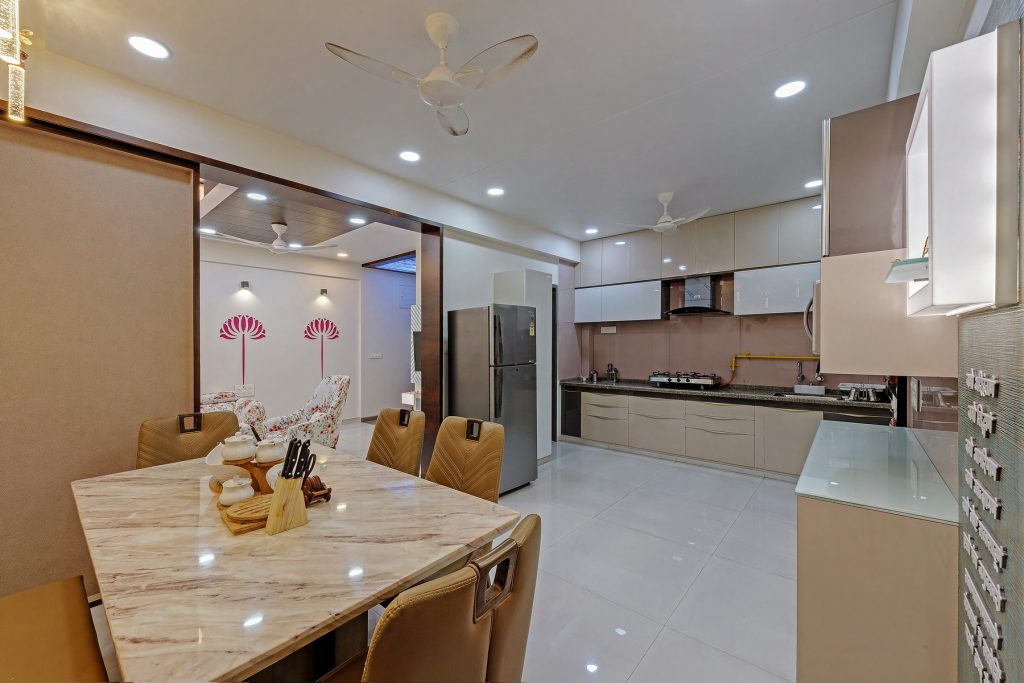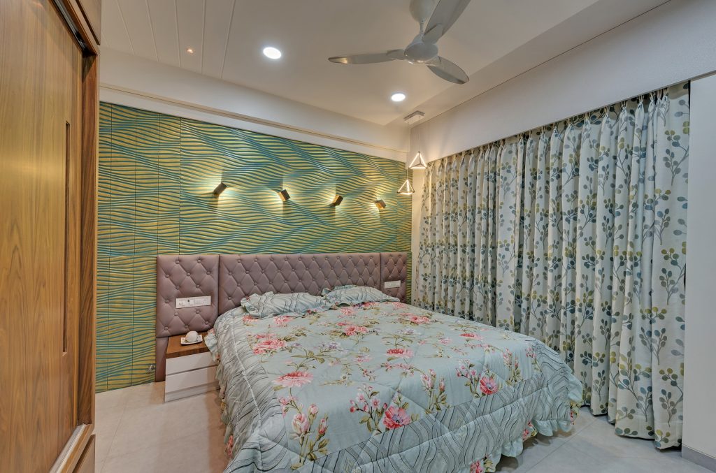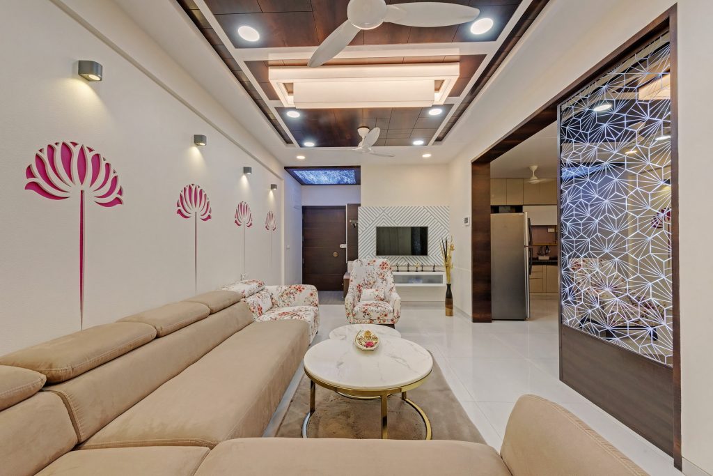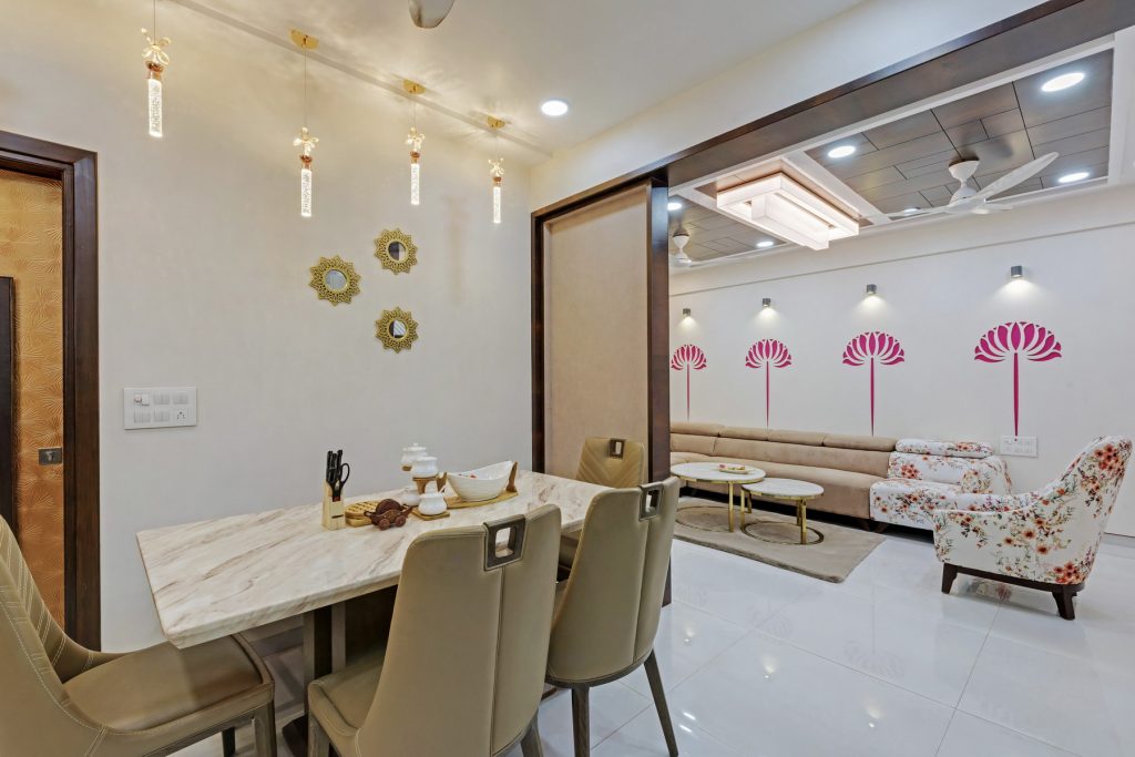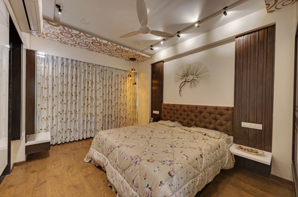 In this home, creativity takes center stage with a dynamic blend of textures, from intricate leatherwork to stretch ceilings and decorative laminates. The fusion of wooden patti elements adds a timeless touch, transforming each space into a uniquely designed haven. This residence is a testament to the artistry of diverse materials, where innovation meets craftsmanship in every detail.