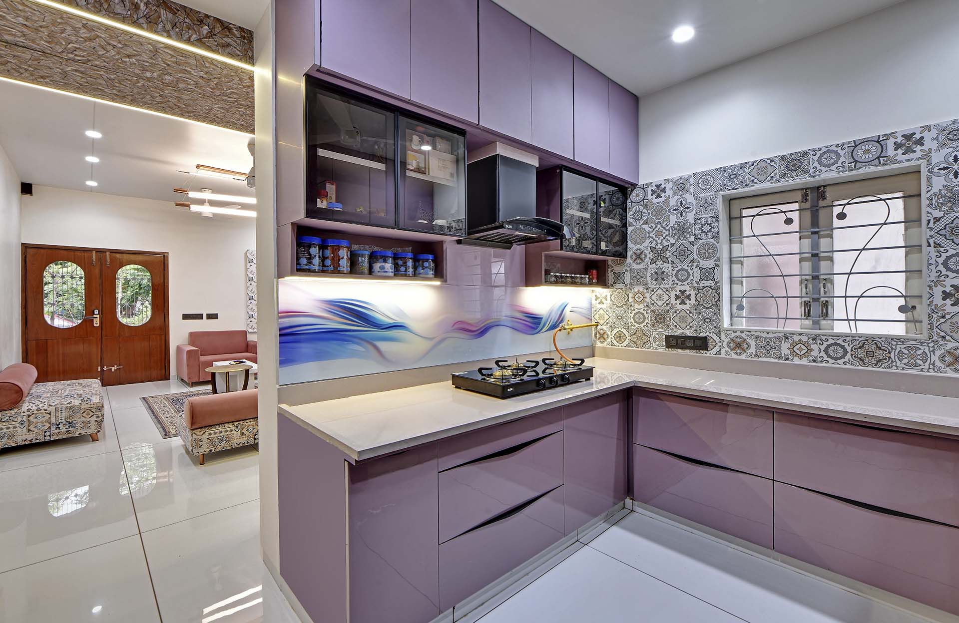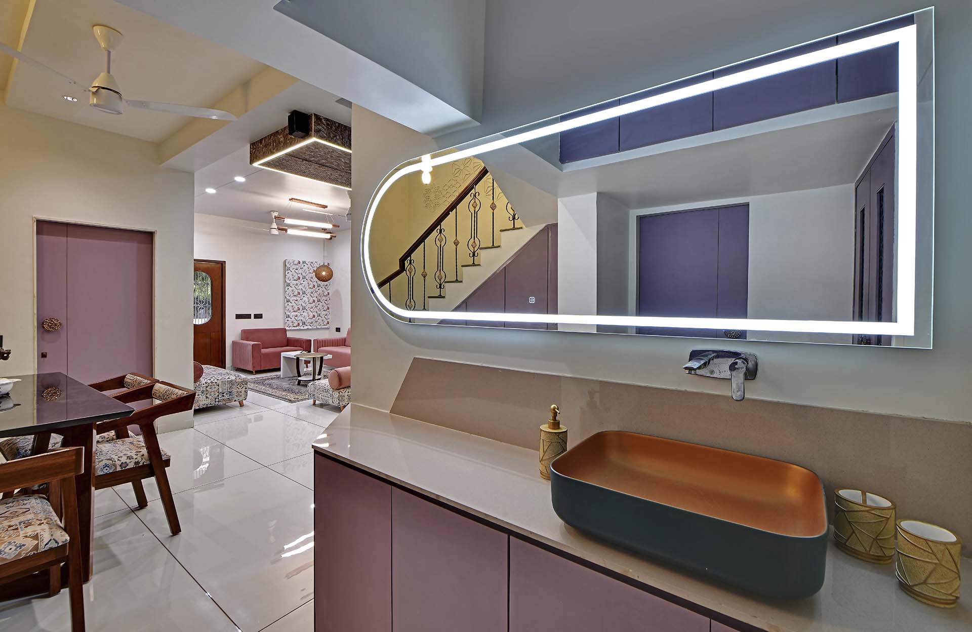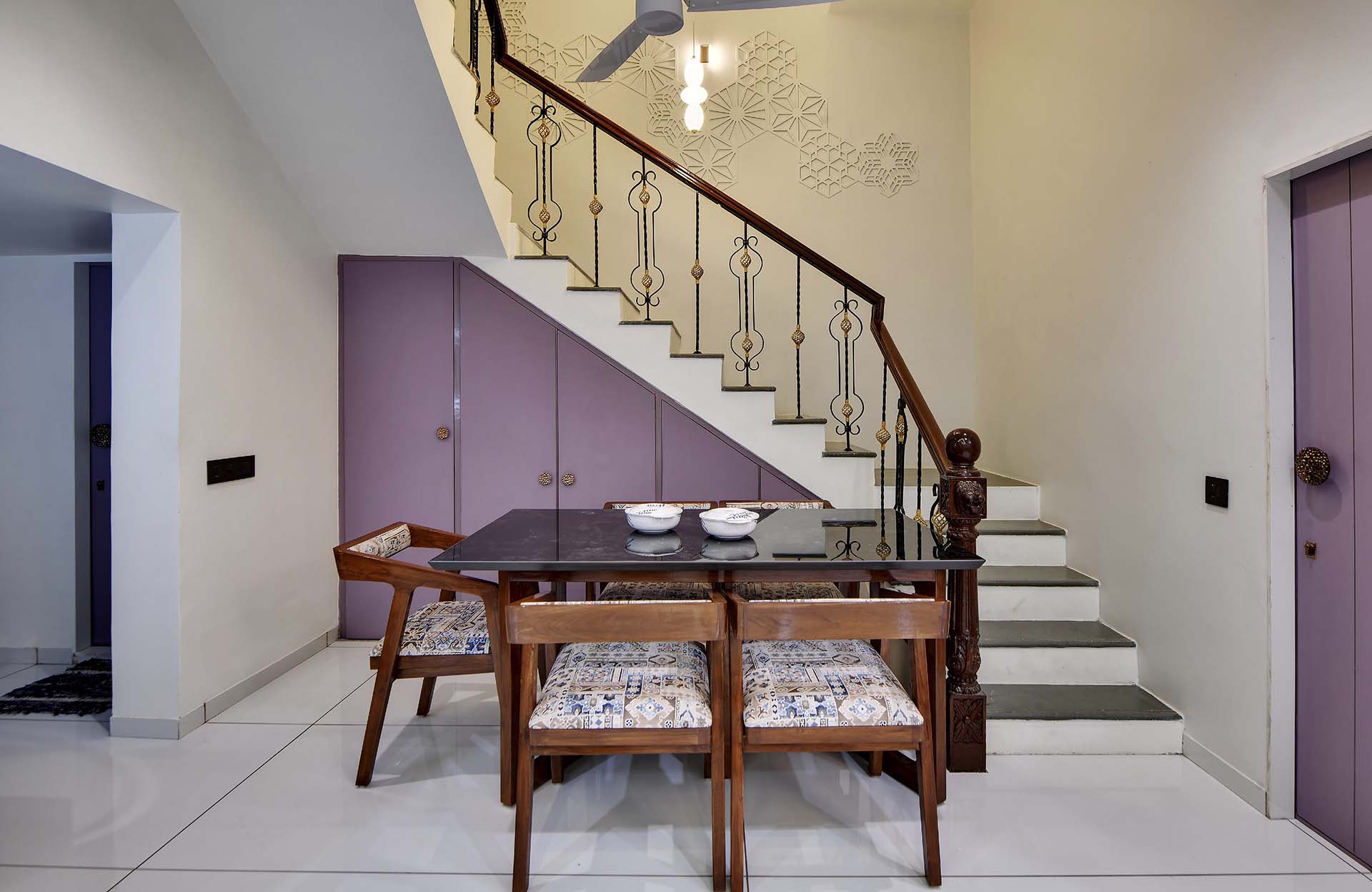 Crafted with an artistic touch, this house seamlessly integrates a variety of materials, including captivating textures, intricate leatherwork, stretch ceilings, decorative laminates, and the warmth of wooden patti. Creative design flourishes in every nook, turning each room into a bespoke masterpiece where a diverse palette of materials converges with effortless sophistication.