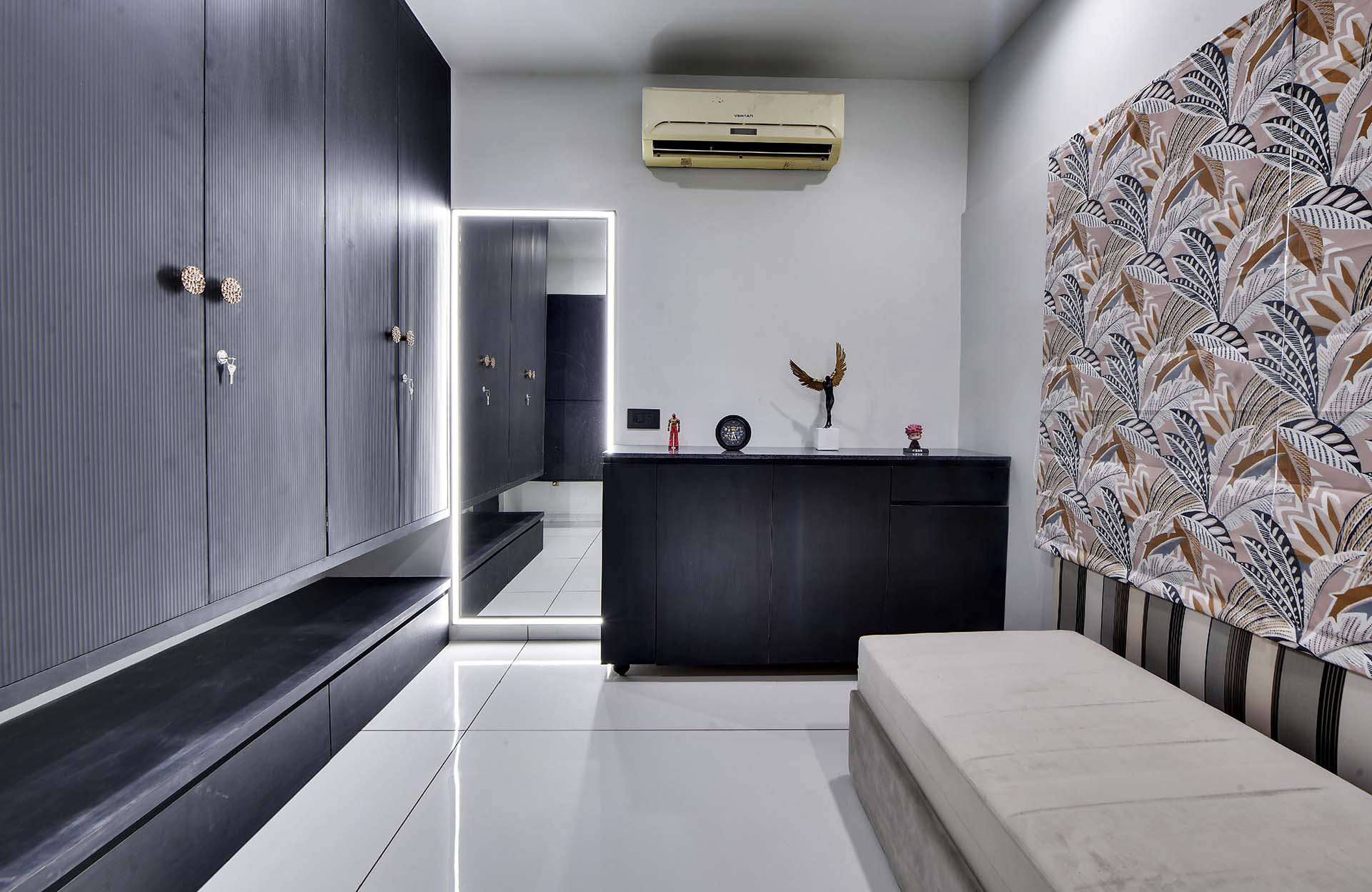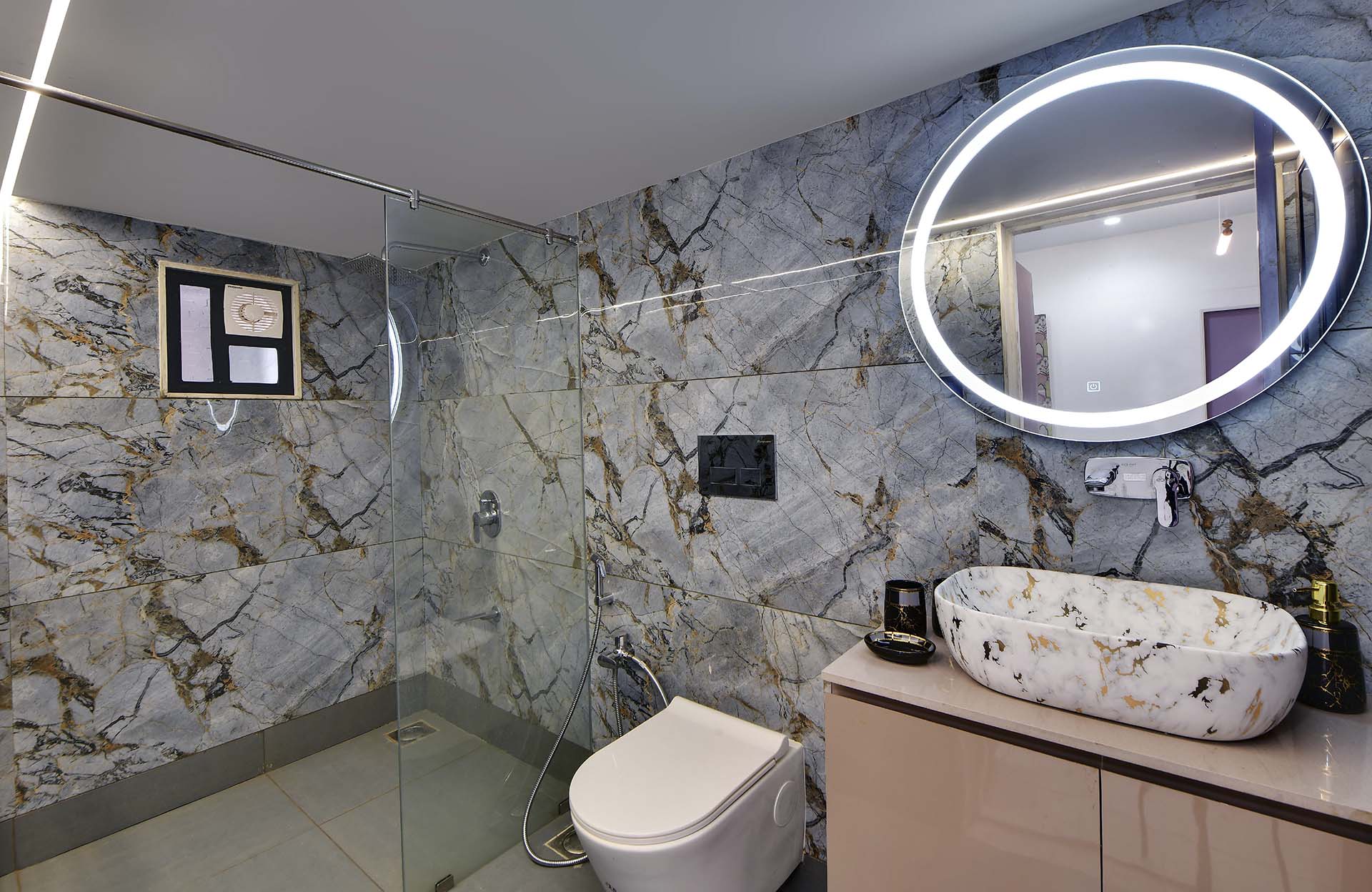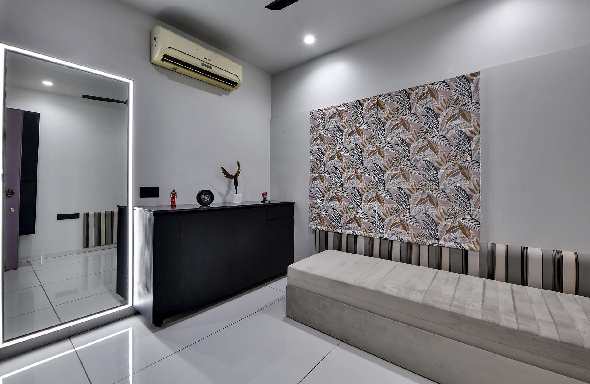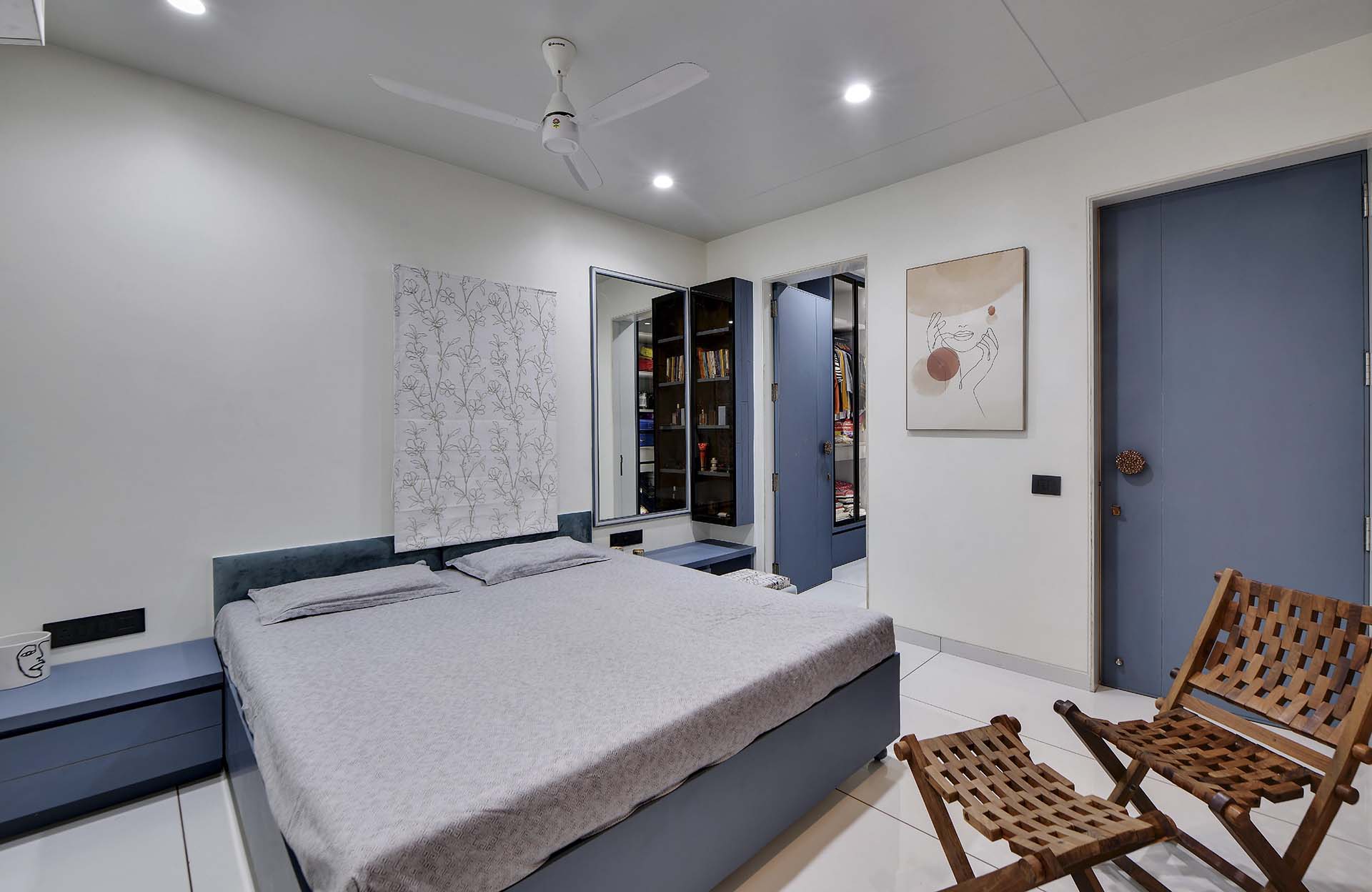 Crafted with an artistic touch, this house seamlessly integrates a variety of materials, including captivating textures, intricate leatherwork, stretch ceilings, decorative laminates, and the warmth of wooden patti. Creative design flourishes in every nook, turning each room into a bespoke masterpiece where a diverse palette of materials converges with effortless sophistication.