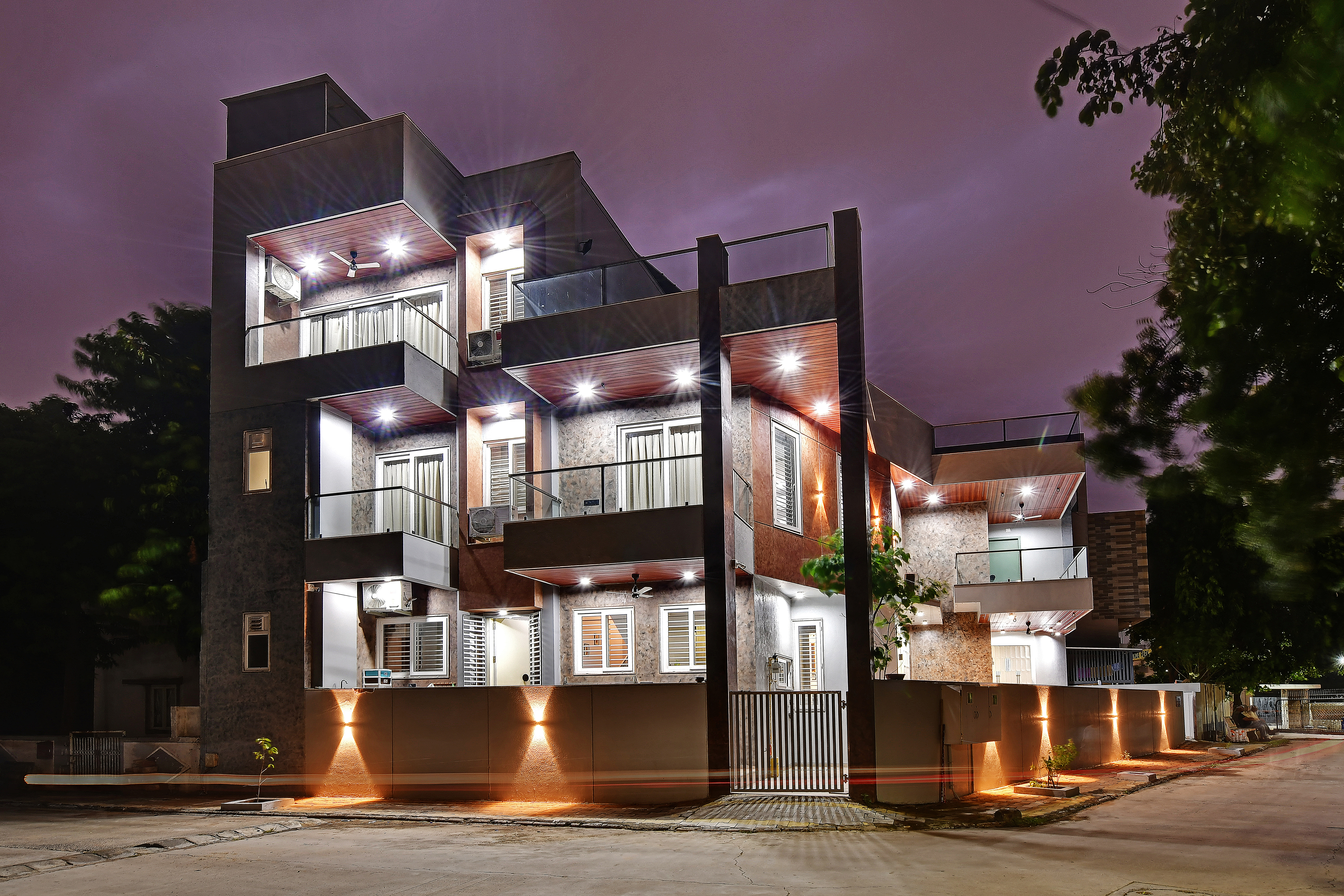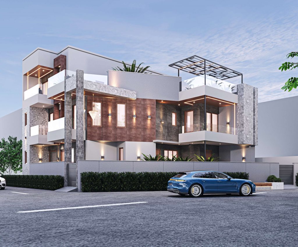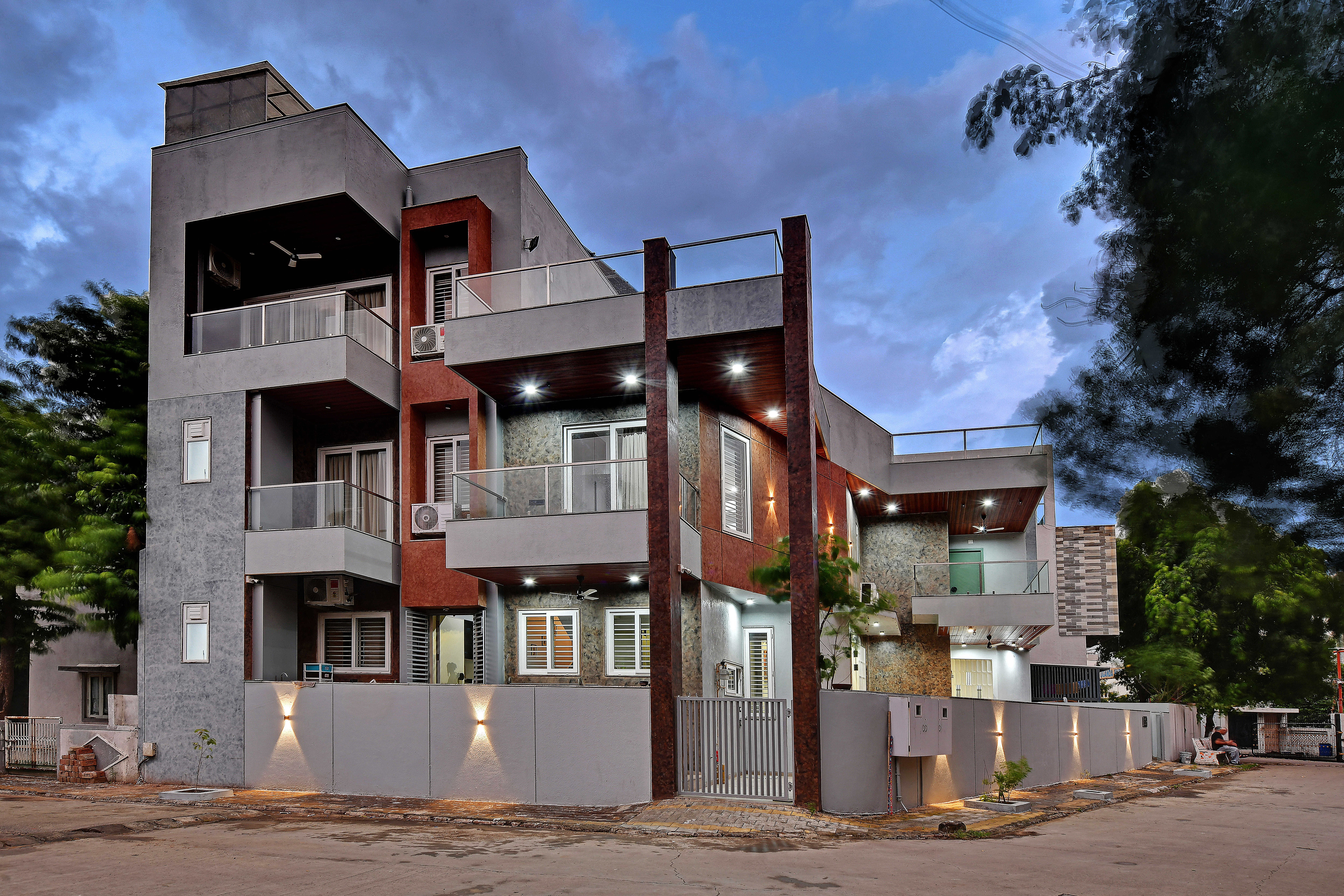 We designed a twin bungalow that beautifully appears as one single bungalow from the outside, creating a seamless and premium visual impact. The elevation features a combination of different textures, enhanced with elegant glass railings that add a modern touch. To elevate the warmth and luxury, wooden ceilings are used in all balconies, enhancing the overall aesthetic appeal. Carefully selected varieties of lighting highlight architectural details and create a soothing, beautiful ambience during the evening. This thoughtful design balances privacy, elegance, and visual harmony—where smart planning meets refined architecture.