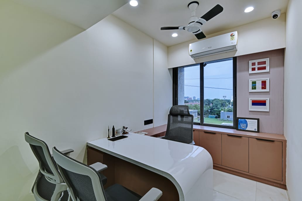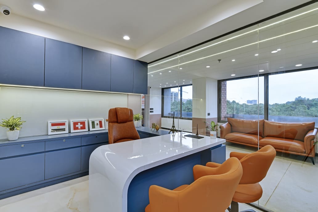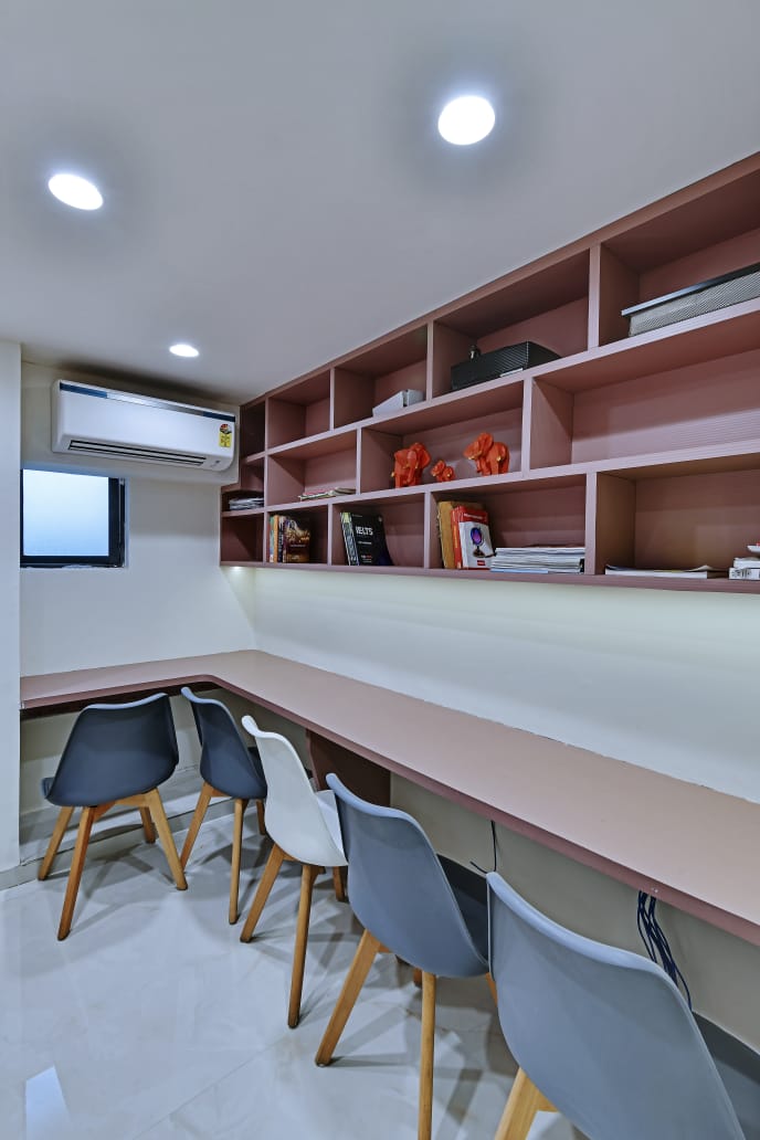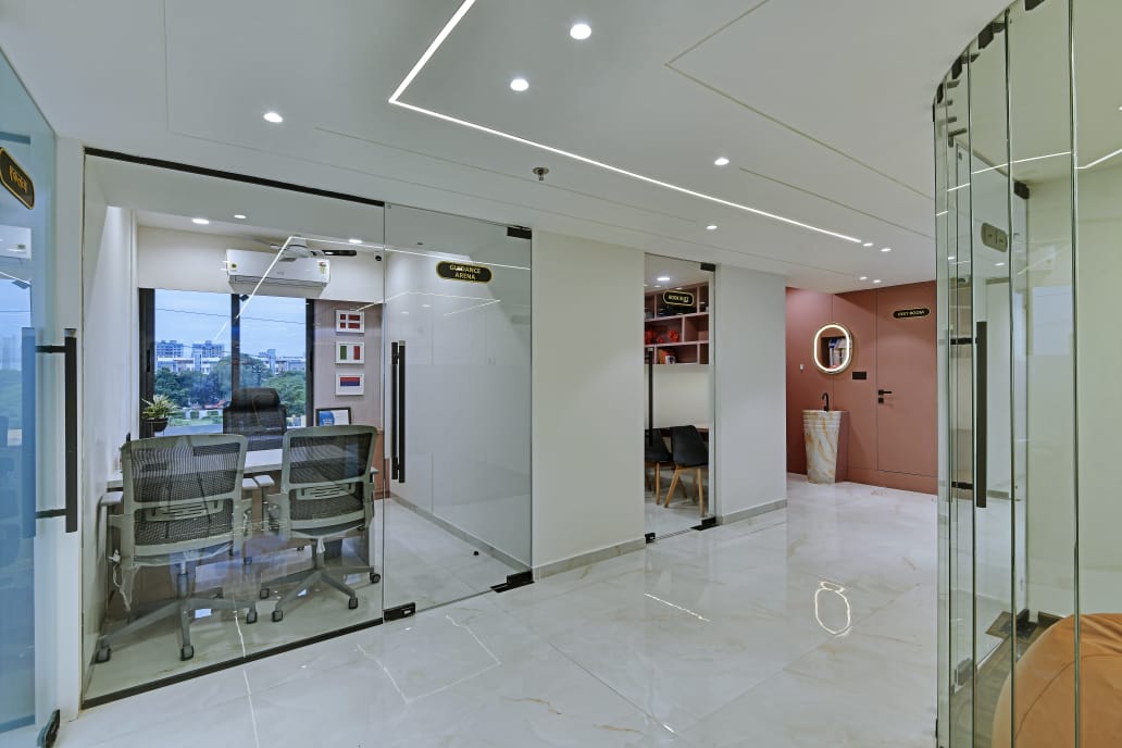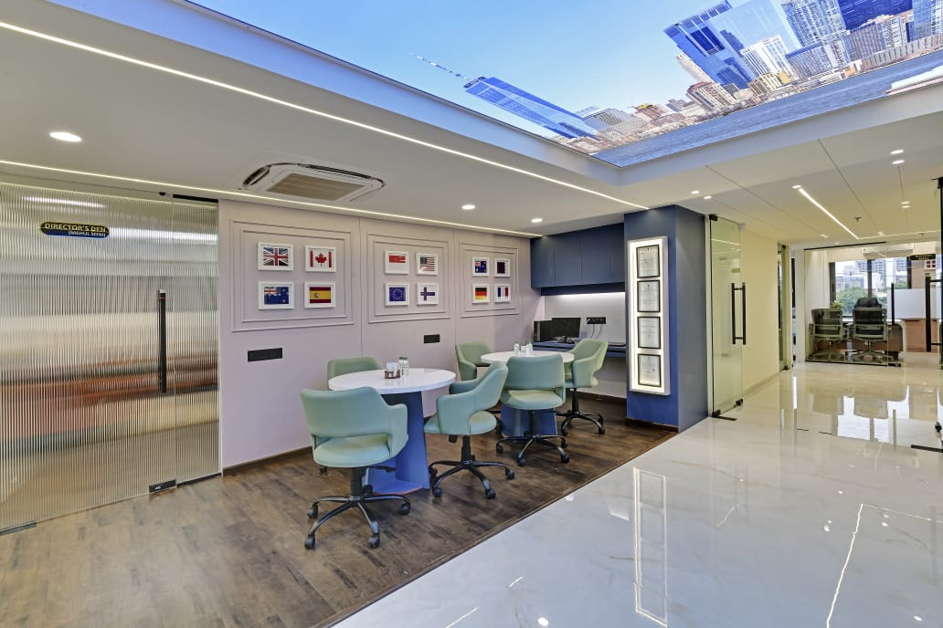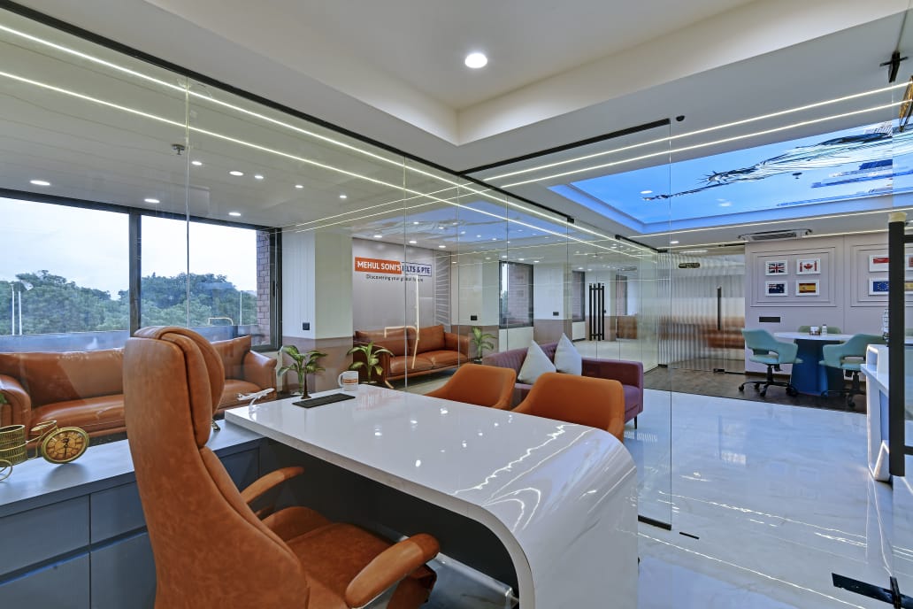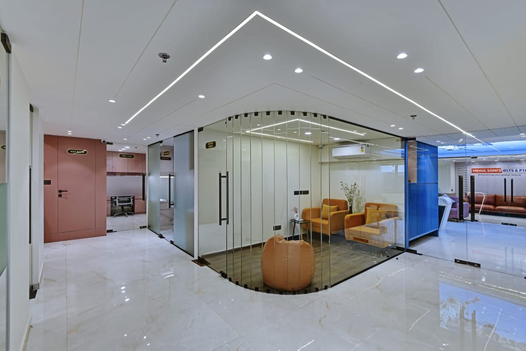 The office interior project for Mehul Soni’s IELTS & PTE, located in Gandhinagar, Gujarat, spans a carpet area of 3,000 square feet. The design seamlessly blends modern aesthetics with functionality, utilizing materials such as glass, laminate, acrylic sheet, Corian, stretch ceiling, and leather. These elements contribute to a contemporary and sophisticated environment that enhances both the visual appeal and the practical aspects of the office space. The choice of materials reflects a commitment to quality and durability, ensuring a professional and welcoming atmosphere for clients and staff alike. The project is a perfect example of a stylish, yet efficient workspace tailored to meet the needs of an educational institution.
